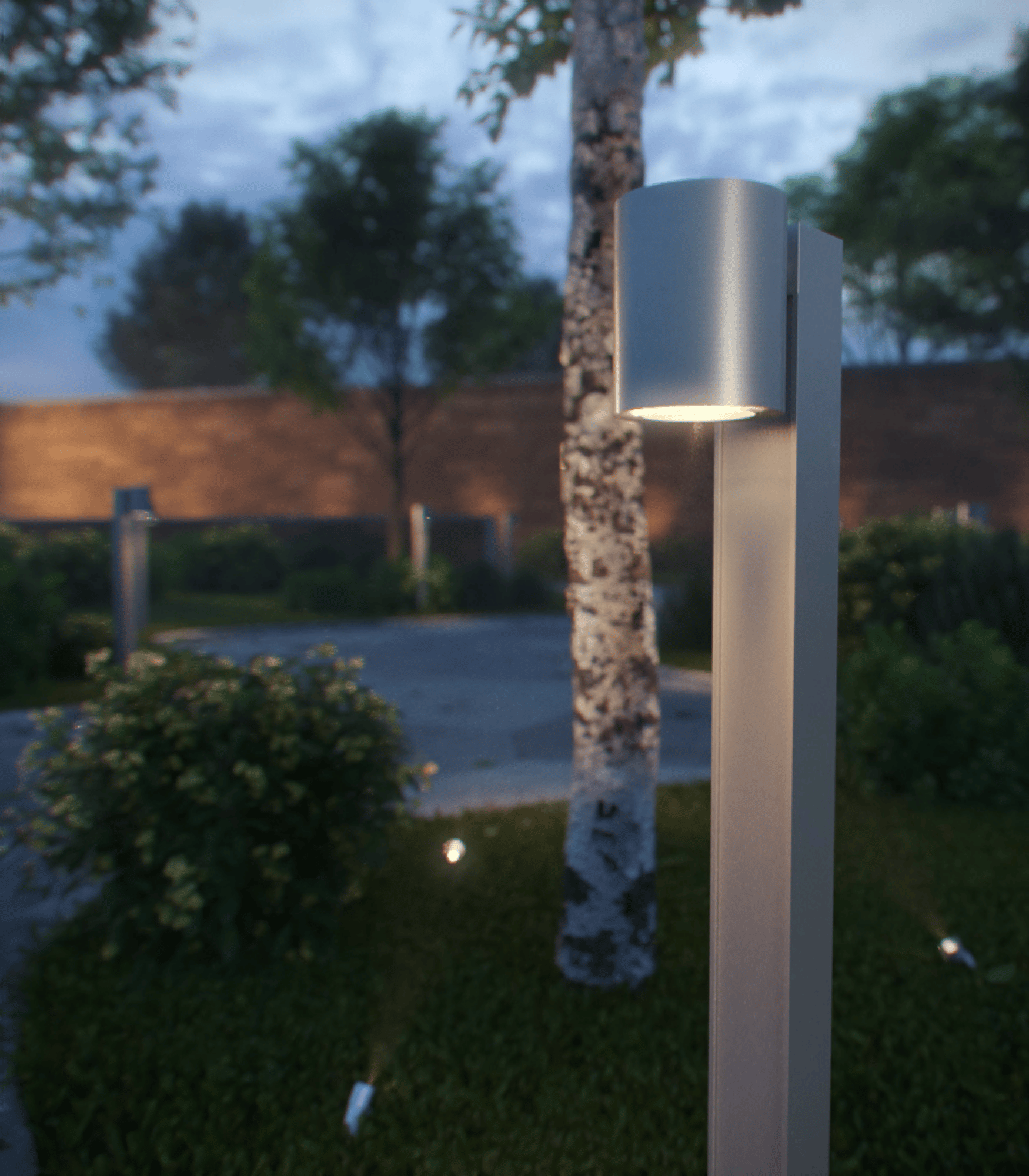 Bollard light with 8W LED. Higher wattage and larger head on customizable-height post. Available in matte clear anodized. Reflectors available for different light distribution.