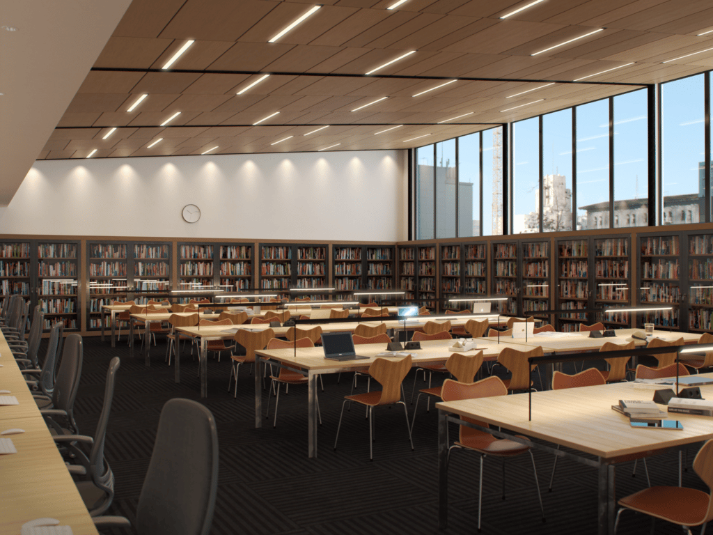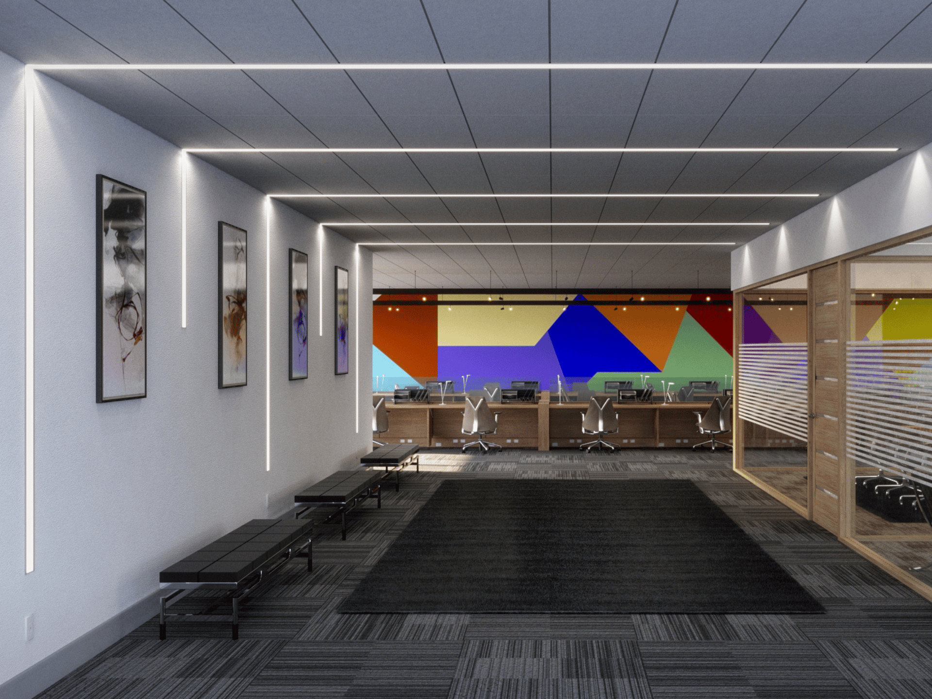 Recessed linear light with 10W/ft and thin trim. Customizable housing length. Frosted or prismatic lens for glare control. Wide flood beam angle, suitable for direct lighting in large or high ceiling spaces, such as conference rooms, hallways & lobbies.